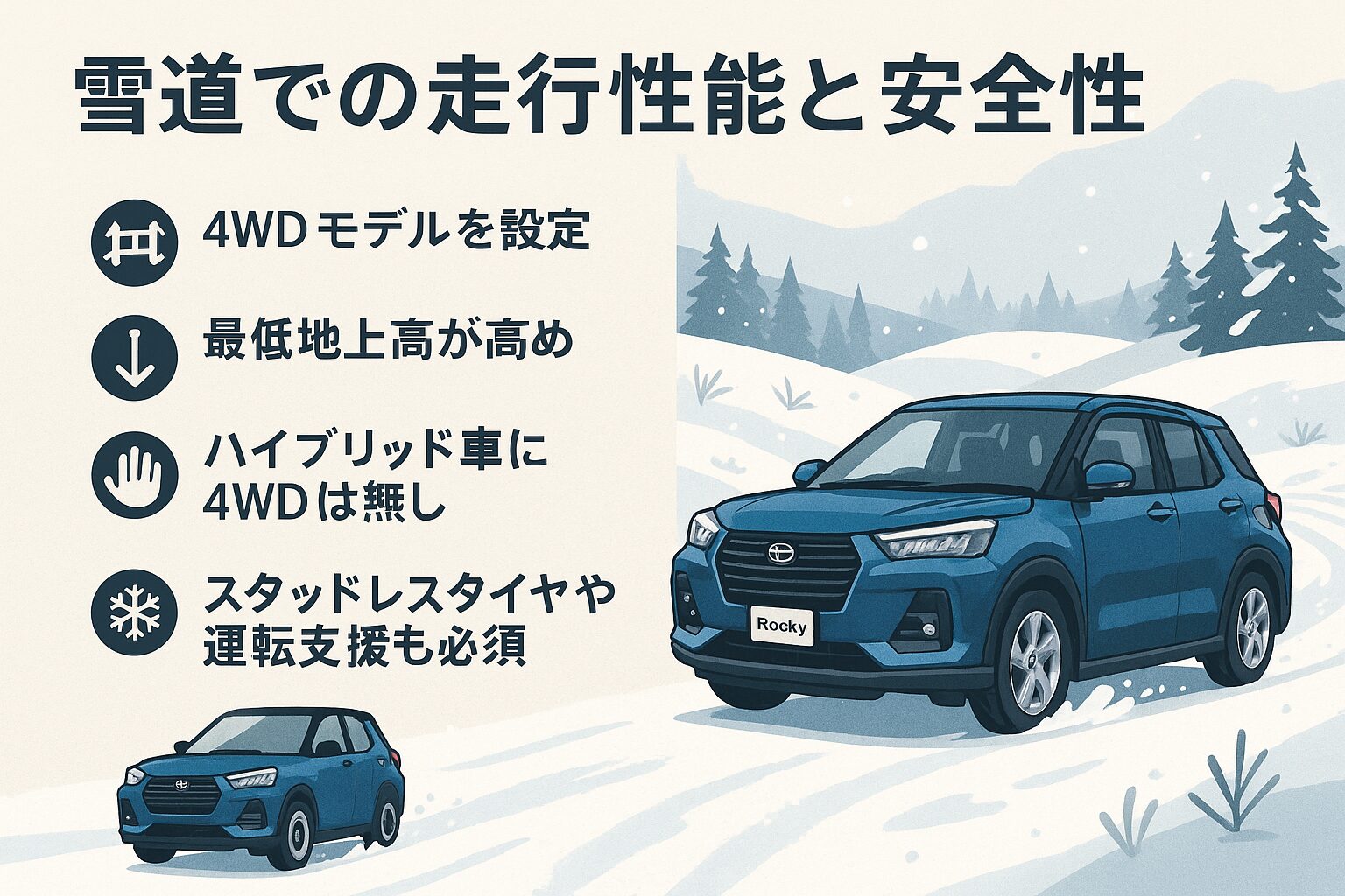 このように、ロッキーは雪道での使用も十分に考慮された設計となっており、冬場の移動が多い方にもおすすめできる車種です。