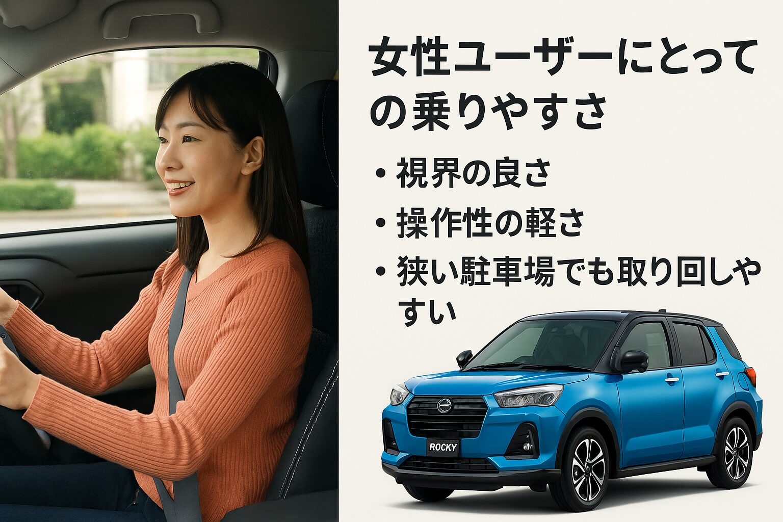 視界の良さと操作性の軽さで、ロッキーは女性にとって非常に運転しやすい車です。